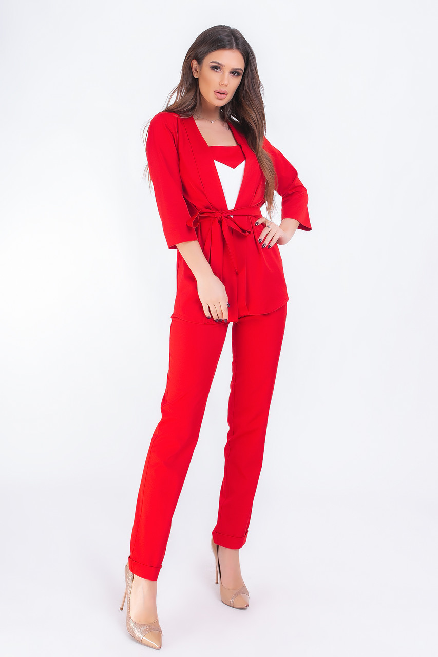 Костюм-трійка жіночий стильний — штани, майка та кардиган із поясом арт 165, колір червоний